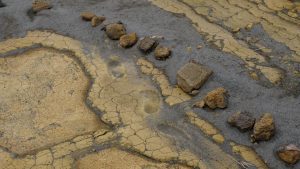 Ein Stück weiter weg: Fußabdrücke in der Oberfläche, die seitdem steinhart geworden ist.