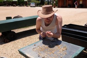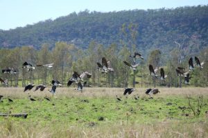 Und wir dachten, wir wären früh dran! Um halb acht Uhr sind wir morgens losgefahren, bei nur 26°. Aber dann hat die Fahrt zum Nationalpark eben nicht zwei Stunden gedauert, wie uns gesagt wurde, sondern drei … weil wir eben wieder so oft anhalten mussten. Da gab es Känguruhs, und so viele Vögel … Emus zum Beispiel. Oder hier: Ibisse.